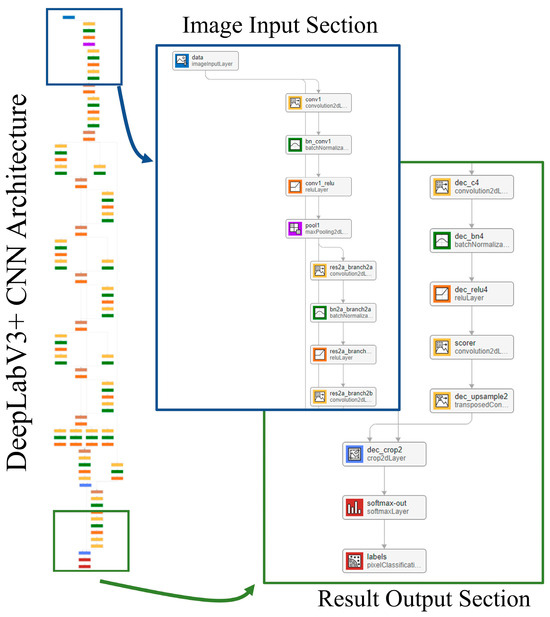 The segmentation model takes a 2D slice from the contrast-enhanced cardiac CT image as input. The output is a pixel-wise classification of the image that is broken down into five classes: LV, LA, Ao, OCS, and BG. Each pixel in the output corresponds to one of these five classes, effectively creating a semantic map of the cardiac structures. The network model used for this segmentation is DeepLabv3+ [25], with the structure shown in Figure 8. The training conditions used for the CNN were the stochastic gradient descent with momentum (SGDM) optimizer with an initial learning rate of 0.0001, a maximum epoch of 3, a mini-batch size of 256, a learn rate drop period of 1, a learn rate drop factor of 0.3, a momentum of 0.9, and an l2 regularization of 0.005.