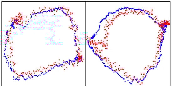 A comparison of the estimated aortic valve ring diameters with the aortic valve ring diameters from the teacher data is shown in Table 10. In Figure 10, the blue dots represent the aortic valve annulus as determined by supervised images, while the red dots indicate the results from object detection. The DSC values of 0.94 and 0.93 demonstrate a high degree of overlap between the two methods. Table 10 compares the estimated diameters of the aortic valve annulus, showing an average error of 2.55 mm.