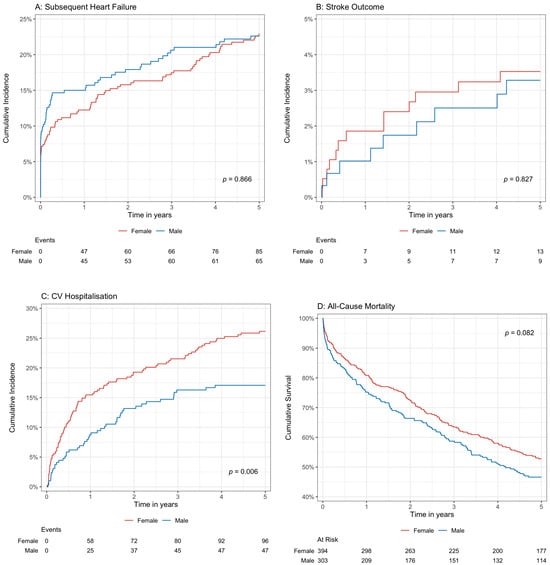 Survival analyses over a period of five years yielded similar results, with female AS patients having a higher incidence rate of CV hospitalization than male patients on cumulative incidence function (Figure 1C) (p = 0.006), but there were no significant differences for subsequent heart failure (p = 0.866), stroke outcome (p = 0.827), and all-cause mortality (p = 0.082) (Figure 1A,B,D, respectively). Subgroup analyses were then performed on moderate (n = 206) and severe (n = 109) AS patients (Table 2 and Supplementary Figures S1A–D and S2A–D).