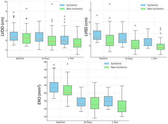Figure 3 illustrates the changes in LVDD, LVSD, and ERO over time. Ischemic FMR patients demonstrated a reduction of LVDD at 30 days [median (IQR): 6.1 (0.5) cm] and at 1 year [5.9 (0.4) cm] compared to baseline [6.4 (0.7) cm; p: 0.03 and p: 0.04, respectively]. Non-ischemic patients showed a similar reduction at 30 days [5.7 (0.4) cm] and at 1 year [5.5 (0.5) cm] versus baseline [6.0 (0.6) cm; p: 0.01 and p: 0.02, respectively]. LVESD decreased significantly at 30 days [ischemic: 4.4 (0.4) cm; non-ischemic: 4.0 (0.5) cm] and at 1 year [ischemic: 4.2 (0.4) cm; non-ischemic: 3.8 (0.4) cm] compared to baseline [ischemic: 4.7 (0.6) cm; non-ischemic: 4.3 (0.6) cm; all p: 0.04]. ERO was also reduced at 30 days [ischemic: 26 (6) mm2; non-ischemic: 21 (7) mm2] and at 1 year [ischemic: 25 (5) mm2; non-ischemic: 20 (7) mm2] versus baseline [ischemic: 44 (10) mm2; non-ischemic: 40 (8) mm2; all p < 0.001].