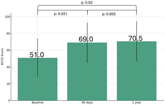 Figure 4 illustrates the distribution of KCQQ scores over time. At 30 day and 1 year follow-up visits, there was a statistically significant increase in KCCQ scores compared to baseline values [median (IQR): 69 (53) versus 51 (38); p = 0.031 and median (IQR): 70.5 (55) versus 51 (38); p = 0.02, respectively].