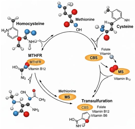 - Vitamin B12 (cobalamin): Vitamin B12 is essential for methylation reactions and neurological integrity. As a coenzyme of methionine synthase and methylmalonyl-CoA mutase, it is critical for both homocysteine elimination and myelin maintenance. Deficiency can result from malabsorption (e.g., pernicious anemia, atrophic gastritis) and leads to hematologic and neurologic symptoms [32]. A schematic view of homocysteine metabolism is provided in Figure 1.