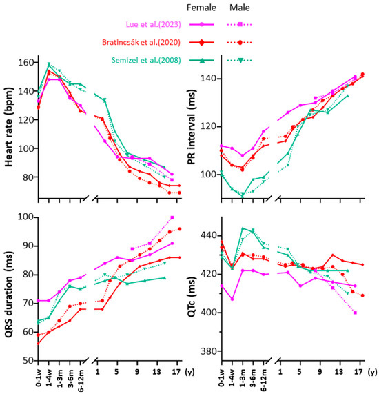Electrophysiological maturation leads to age-dependent changes in the surface electrocardiogram (ECG). In three major studies, collectively including over 30,000 healthy individuals, age- and sex-related trends in ECG parameters have been identified, as summarized in Figure 1 [45,46,47].