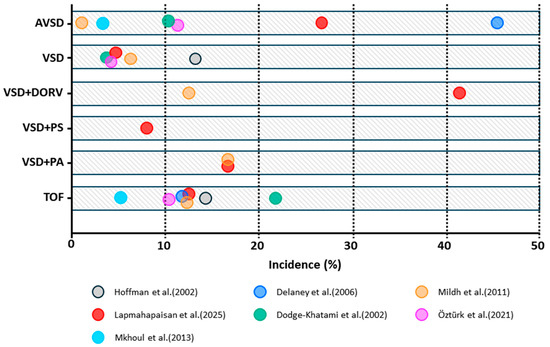 JET typically occurs after surgical procedures involving the region of the His bundle, such as the repair of TOF, VSD, and AVSD, and is characterized by abnormal automaticity near the AVN with AV dissociation [103]. In contrast, EAT generally presents later, often within 14 days postoperatively [104,105,106]. Both arrhythmias are consistently associated with prolonged intensive care unit stays and increased duration of mechanical ventilation [97,98,101,102,104]. Although most studies have not demonstrated an increased mortality associated with JET, a cohort study of 874 patients reported a significant association between JET and higher mortality [98]. Figure 3 provides a summary of JET incidence across different CHD subtypes.