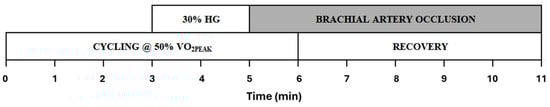 Similarly to the protocol used from a previous study [19], an upper limb isometric handgrip exercise and blood flow occlusion were used to minimize the impairment of venous return during exercise in the study. It has been reported that post-exercise circulatory occlusion following isometric handgrip exercise increases sympathetic output without affecting venous return [32]. Prior to the trial, each participant had a familiarization period on how to perform the isometric handgrip exercise at 30% MVC with real-time visual feedback of the force on a display during the submaximal cycling exercise. Immediately 3 min after exercise, they performed the isometric handgrip exercise for 2 min. The blood flow occlusion, using a cuff placed over the brachial artery of a dominant arm (inflation to 200 mmHg), began 5 s before the isometric exercise ended. The occlusion induced MMA and continued for 1 min of cycling exercise and for 5 min of PHRR (Figure 1). The total duration of MMA was 6 min. The same exercise protocol was repeated after either the placebo (PL) or GSE. Participants were instructed to rest, hydrate, and follow an identical diet for 24 h prior to all study days.