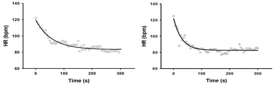 HR data was measured at 5 s intervals throughout the experiment. The PHRR was evaluated between GSE and PL at every min. for 300 s. Heart rate recovery kinetics (Tau) were analyzed using software (SigmaPlot 14, Grafiti LLC, Palo Alto, CA, USA). HR data was analyzed from the end-exercise HR to 5 min after post-exercise recovery. Curve fit was modeled using the following equation: Y = Y0 + A*exp (-b*x). The model parameters were estimated using non-linear regression. Y indicates heart rate at any given time. Y0 + A indicates the starting point of the curve fitting region, and A indicates the amplitude of the change in heart rate from end-exercise to end-recovery. b indicates the time constant (Tau) and the time for heart rate to attain 63% of total amplitude.