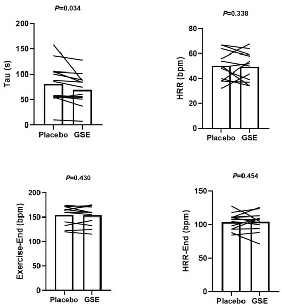 Figure 3 shows the effects of MMA on heart rate recovery from the cycle exercise after PL and GSE supplementation. Heart rate recovery kinetics significantly improved following GSE supplementation compared with the PL condition (ES = 0.4). There were no significant differences in HRR, exercise end, and HRR end between PL and GSE supplementation.