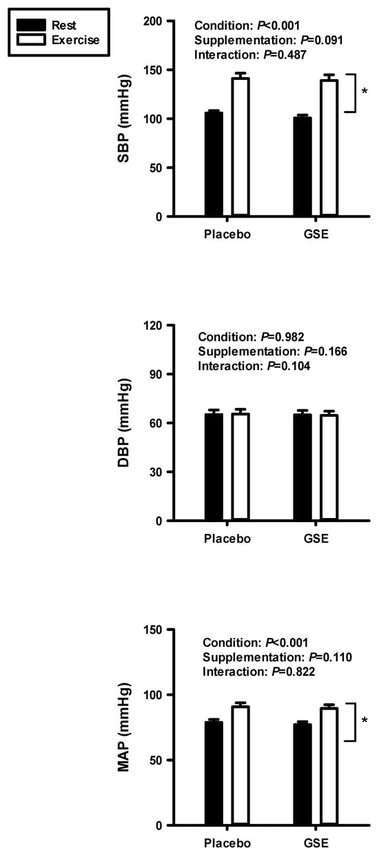 Systolic blood pressure (SBP), diastolic blood pressure (DBP), and mean arterial pressure (MAP) at rest and during cycling exercise after supplementation with PL and GSE. * Vertical bracket indicates significant condition effect.