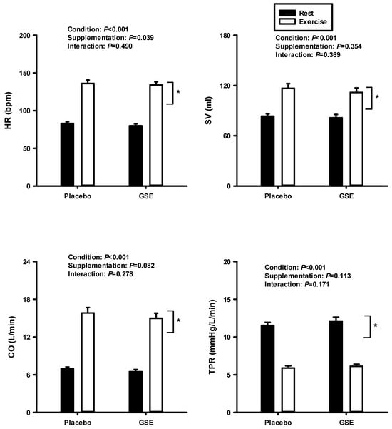 Heart rate (HR), stroke volume (SV), cardiac output (CO), and total peripheral resistance (TPR) at rest and during cycling exercise after supplementation with PL and GSE. * Vertical bracket indicates significant condition effect.