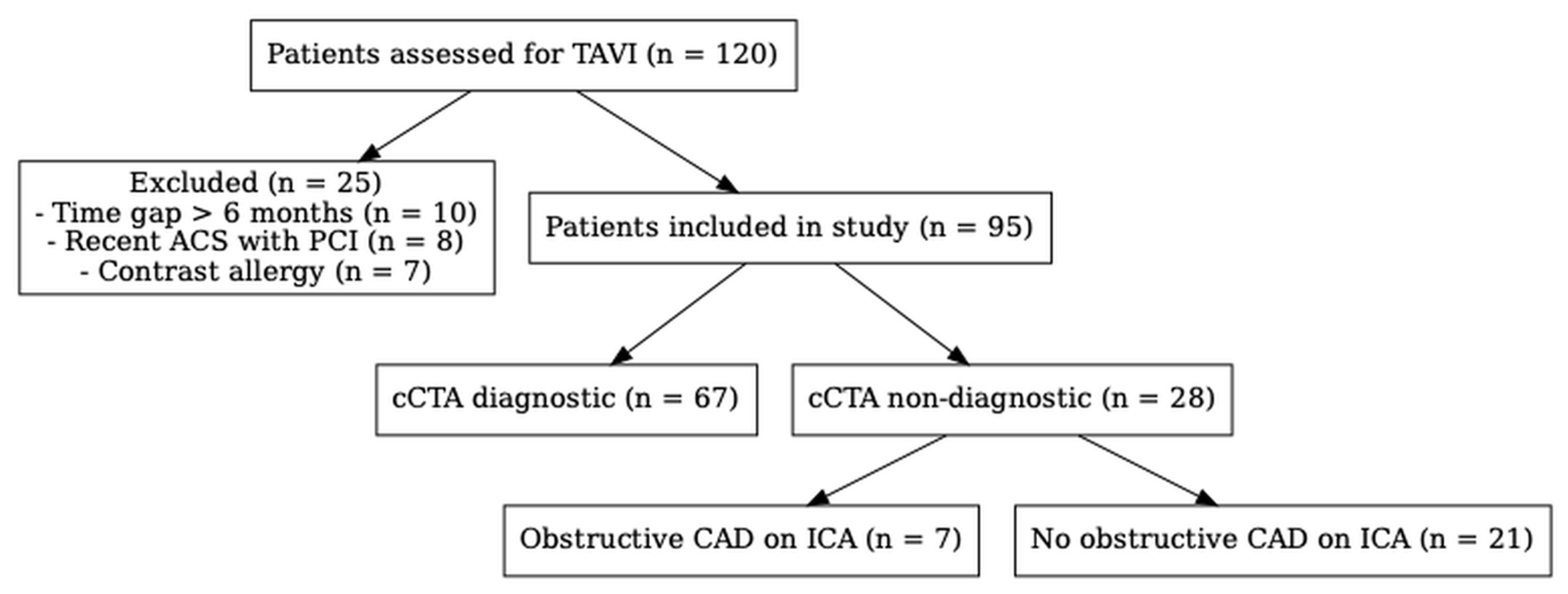 Figure 1. Flowchart of patient selection and diagnostic evaluability. A total of 120 patients were screened for TAVI between June 2022 and May 2024. After exclusions, 95 were included in the final analysis. Coronary CTA was non-diagnostic in 28 patients due to factors including stents, heavy calcification, motion artifacts, or poor contrast opacification. Of these, 7 were ultimately diagnosed with obstructive CAD with invasive coronary angiography.