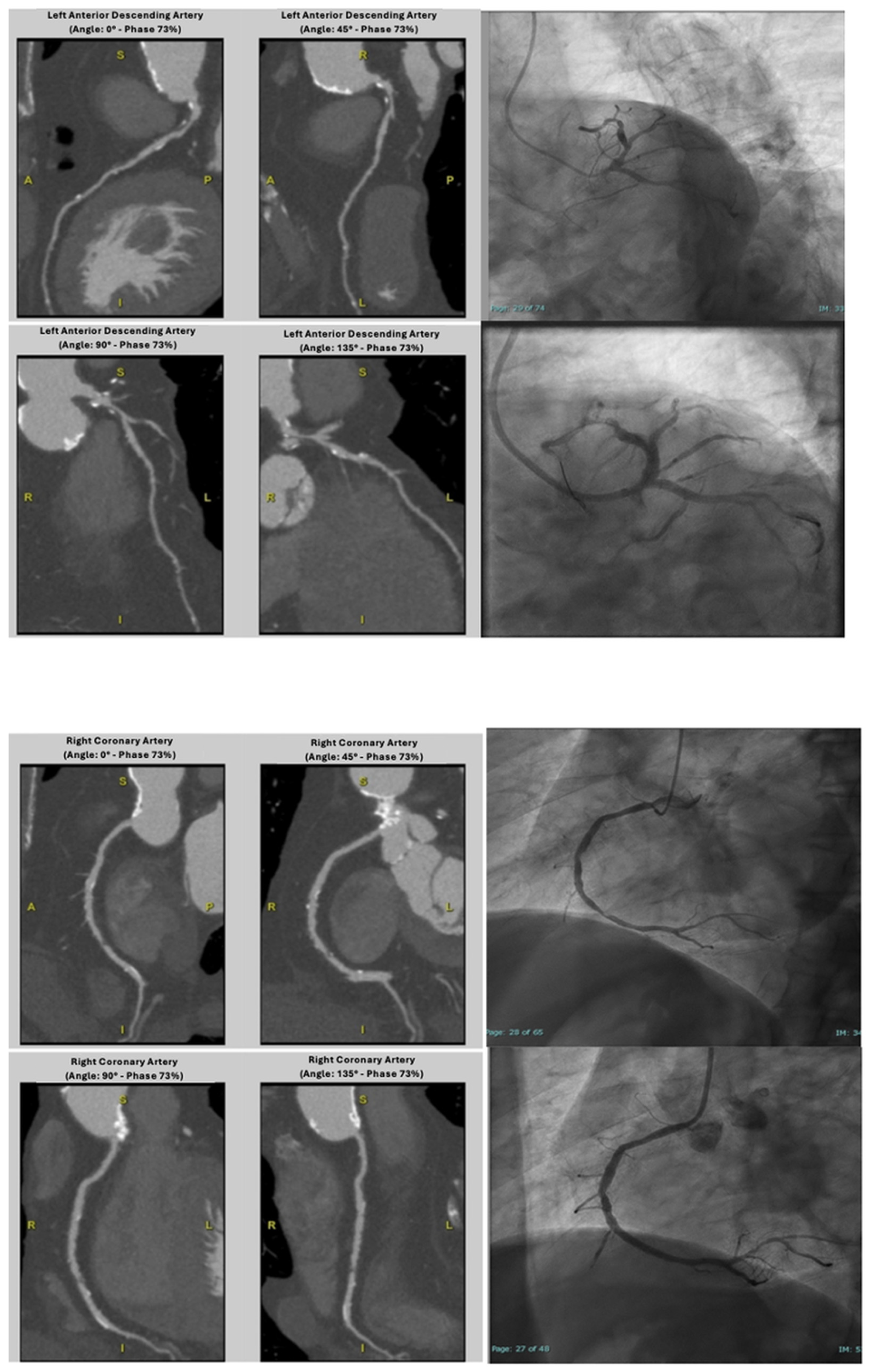 After visually identifying the optimal diagnostic phases, coronary arteries were evaluated through a dedicated software; images were processed with the “Snap Shot Freeze technique” to reduce motion artifacts (Figure 2). Coronary arteries were segmented as recommended by the AHA guidelines [14] and analyzed using multiplanar reconstructions accompanied by measurements of the vessel area in the case of luminal stenosis. Sharp-kernel reconstruction was available and applied to improve accuracy in the diagnostic phase in the presence of severe calcification, in order to reduce blooming artifacts. ICA, on the other hand, was performed by experienced cardiologists at the Hemodynamics Department, using standard techniques and projections. All procedures were conducted in accordance with current guidelines and regulations.