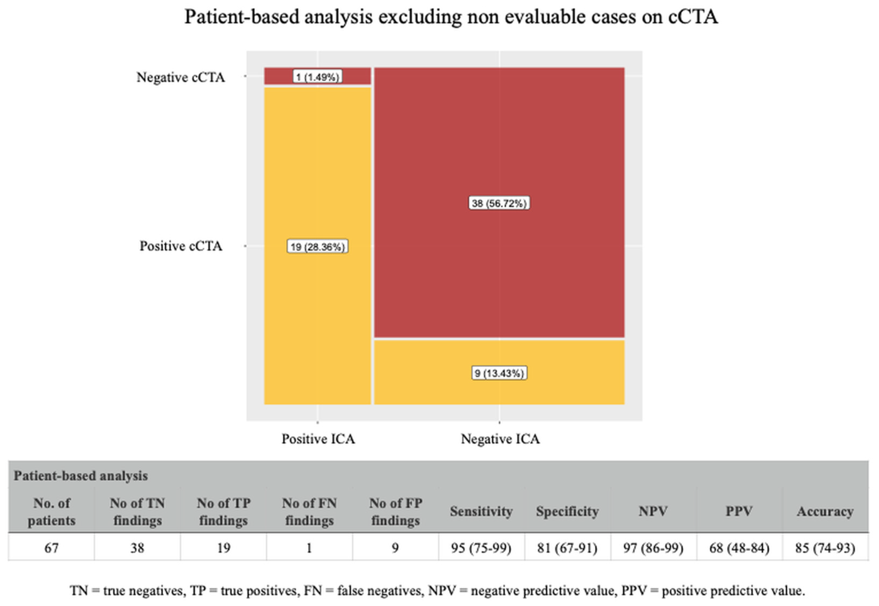 Figure 3. Diagnostic performance of cCTA (patient-based analysis) excluding non-diagnostic cases. In patients with diagnostic-quality cCTA, the method demonstrated a positive predictive value of 68%, a negative predictive value of 97%, and an overall accuracy of 85% compared to ICA.