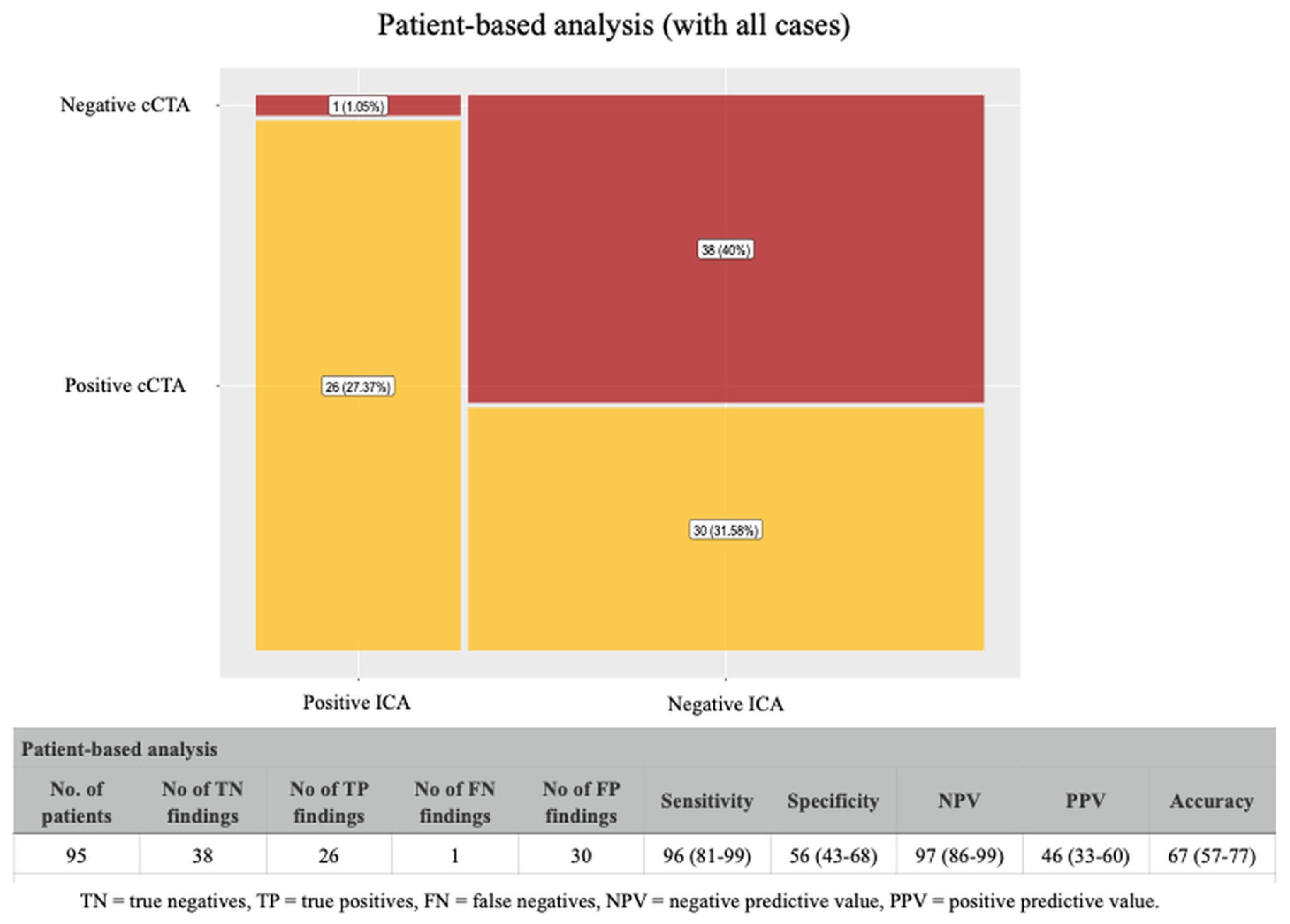 Figure 4. Diagnostic performance of cCTA (patient-based analysis) including non-diagnostic cases. When non-diagnostic cCTA scans were included in the analysis, the positive predictive value dropped to 46% and overall accuracy to 67%, while the negative predictive value remained high at 97%.