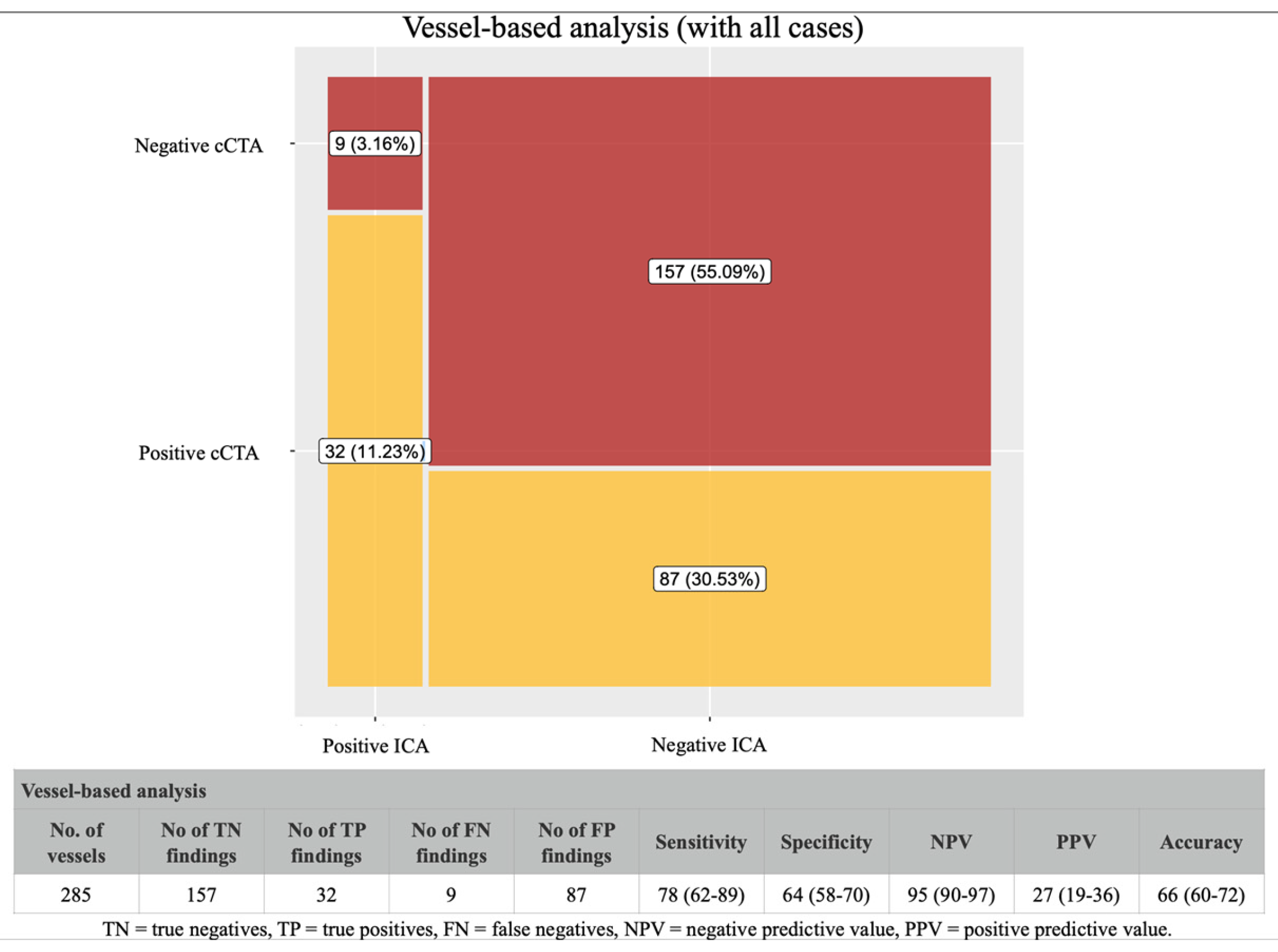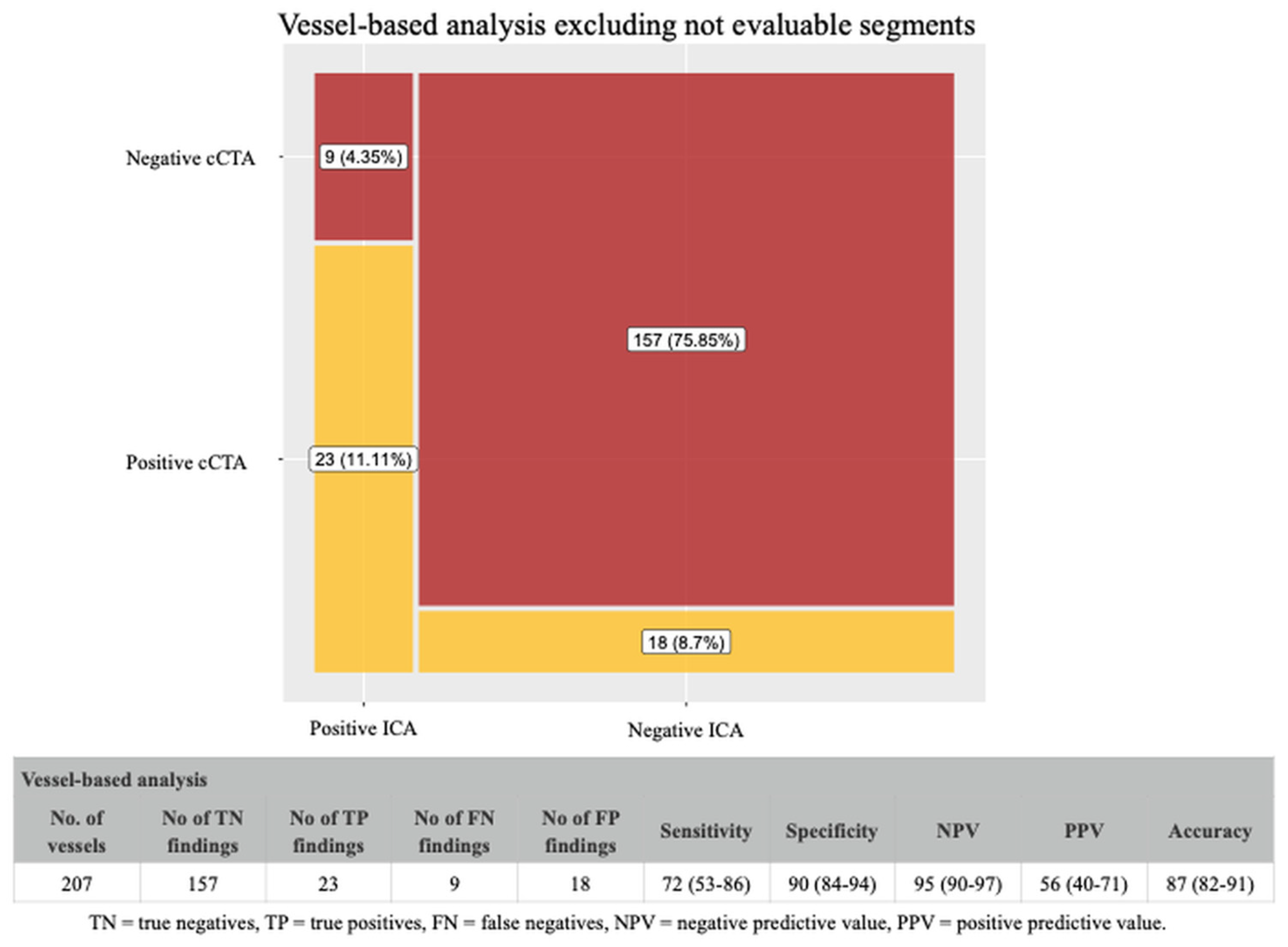Figure 5. Diagnostic performance of cCTA (vessel-based analysis) excluding non-evaluable vessels. After excluding 78 non-evaluable vessels, cCTA showed a positive predictive value of 56%, a negative predictive value of 95%, and an overall accuracy of 87% in identifying obstructive CAD at the vessel level.