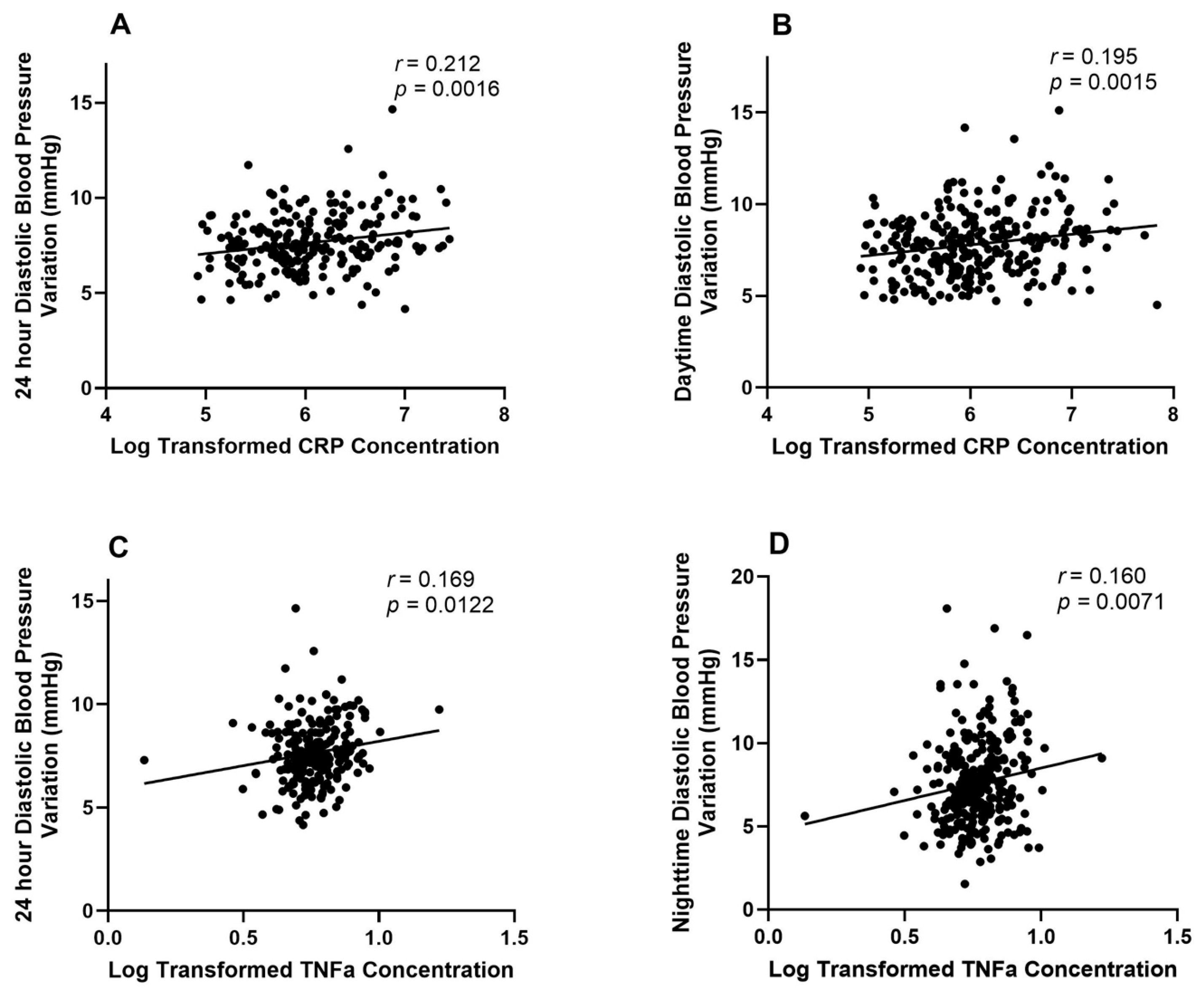 - Kim, K.-I.; Lee, J.-H.; Chang, H.-J.; Cho, Y.-S.; Youn, T.-J.; Chung, W.-Y.; Chae, I.-H.; Choi, D.-J.; Park, K.U.; Kim, C.-H. Association between Blood Pressure Variability and Inflammatory Marker in Hypertensive Patients. Circ. J. 2008, 72, 293–298. [Google Scholar] [CrossRef]