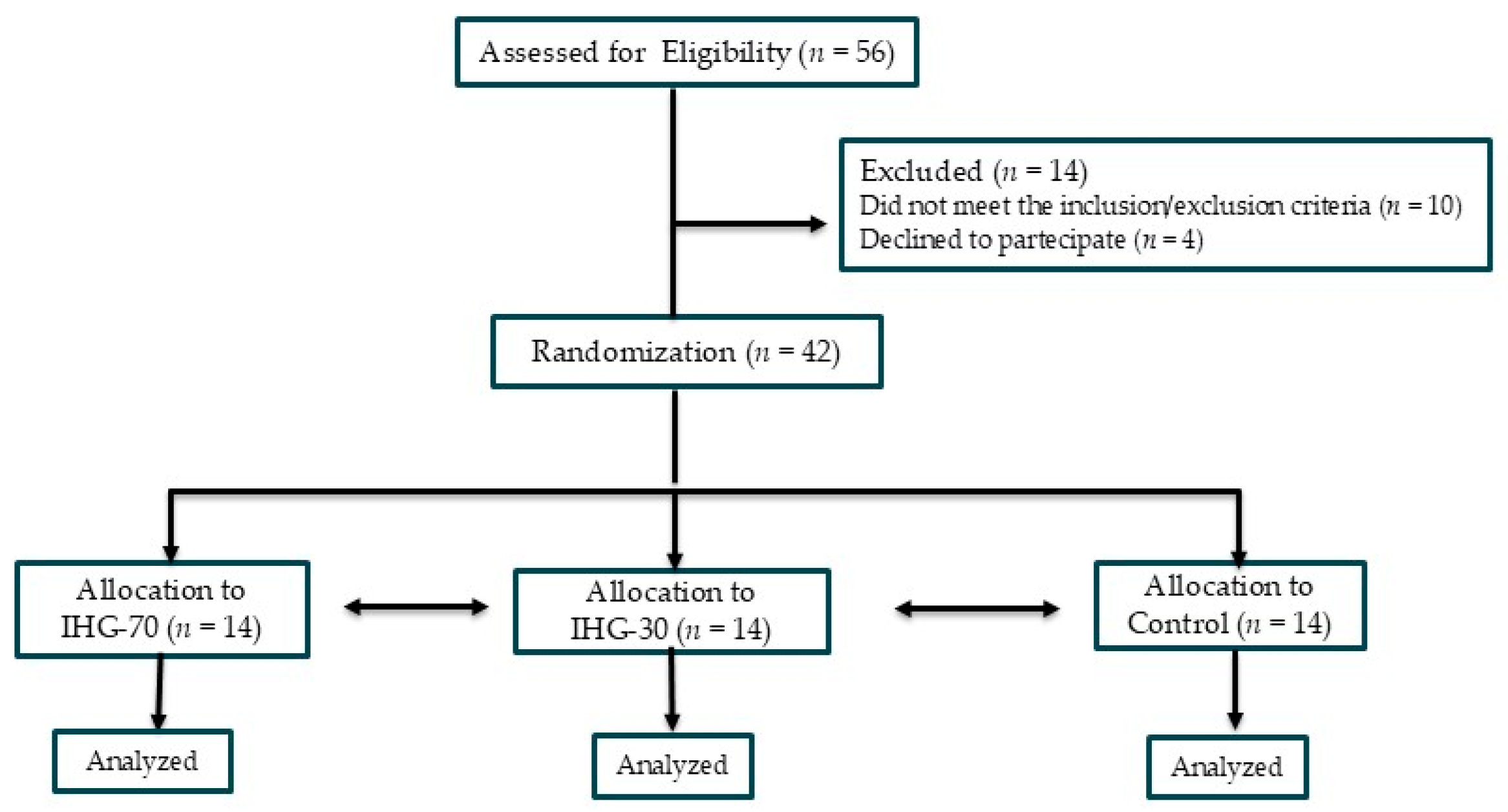IHG-70 (n = 14) | IHG-30 (n = 14) | Control (n = 14) | ANOVA p | |