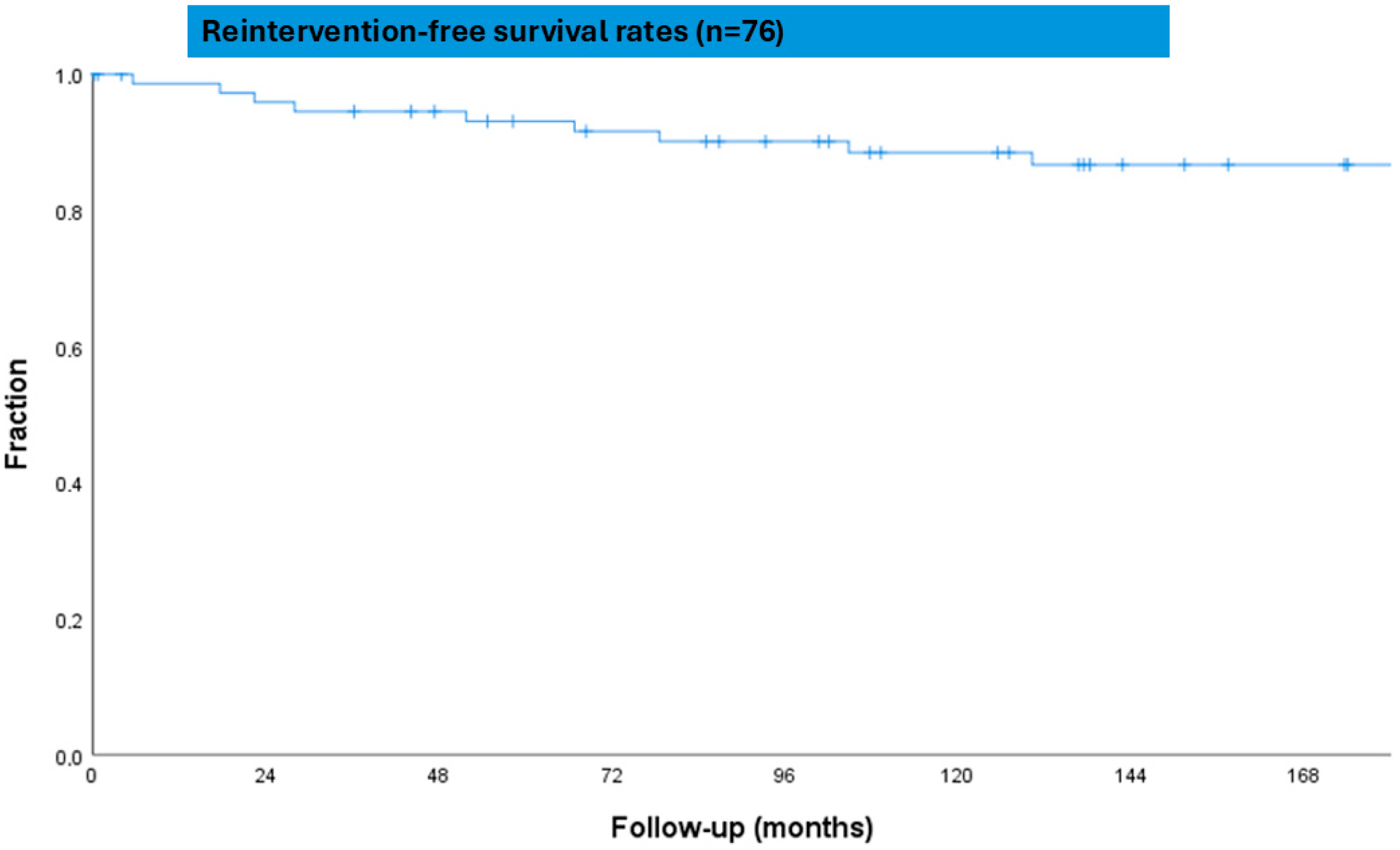 In our cohort, the reintervention-free survival rates at 5 and 10 years were 93.4% and 89.5%, respectively (