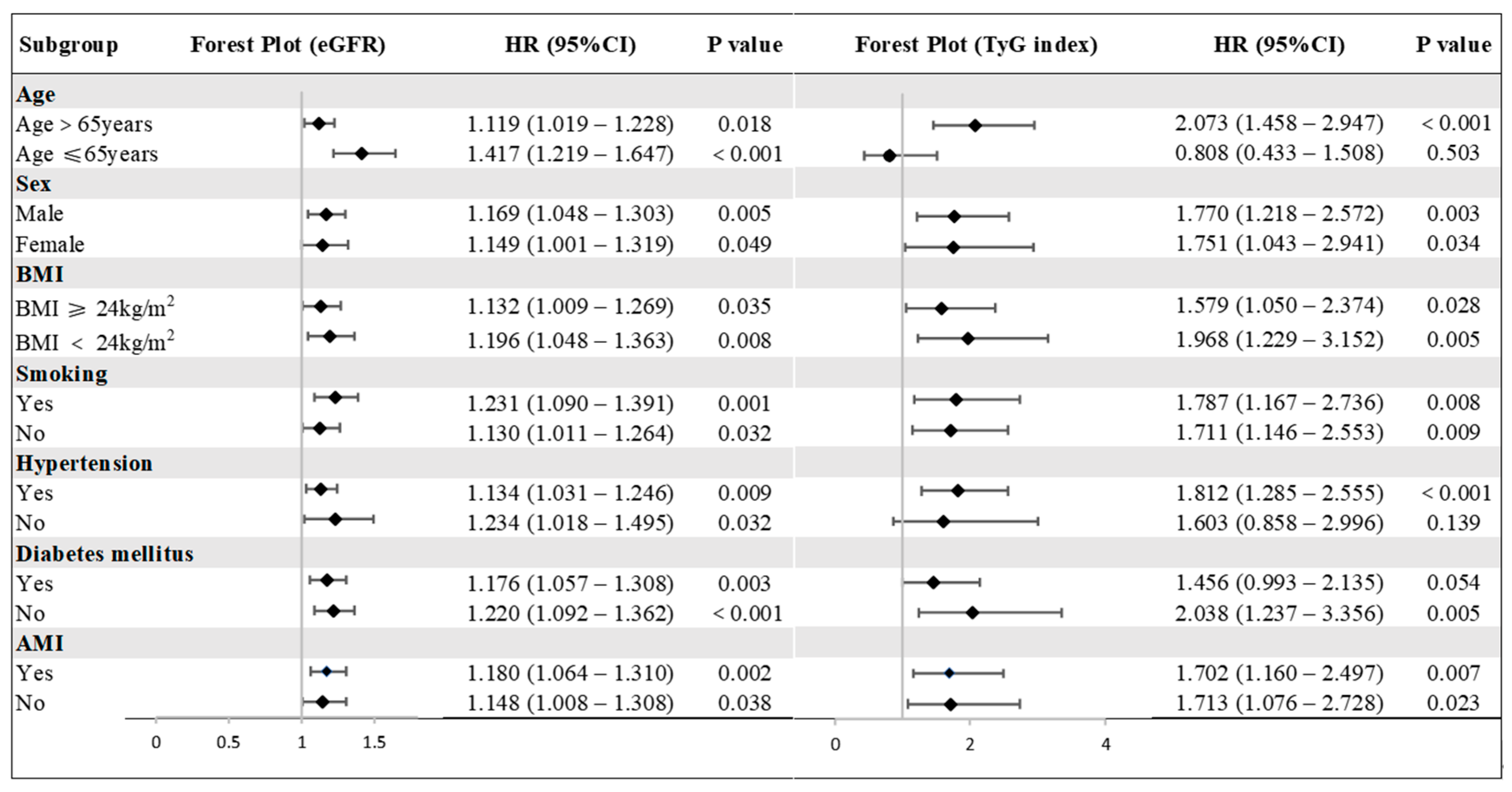 3.4. The Predictive Value of the TyG Index and eGFR for MACEs in Various Subgroups