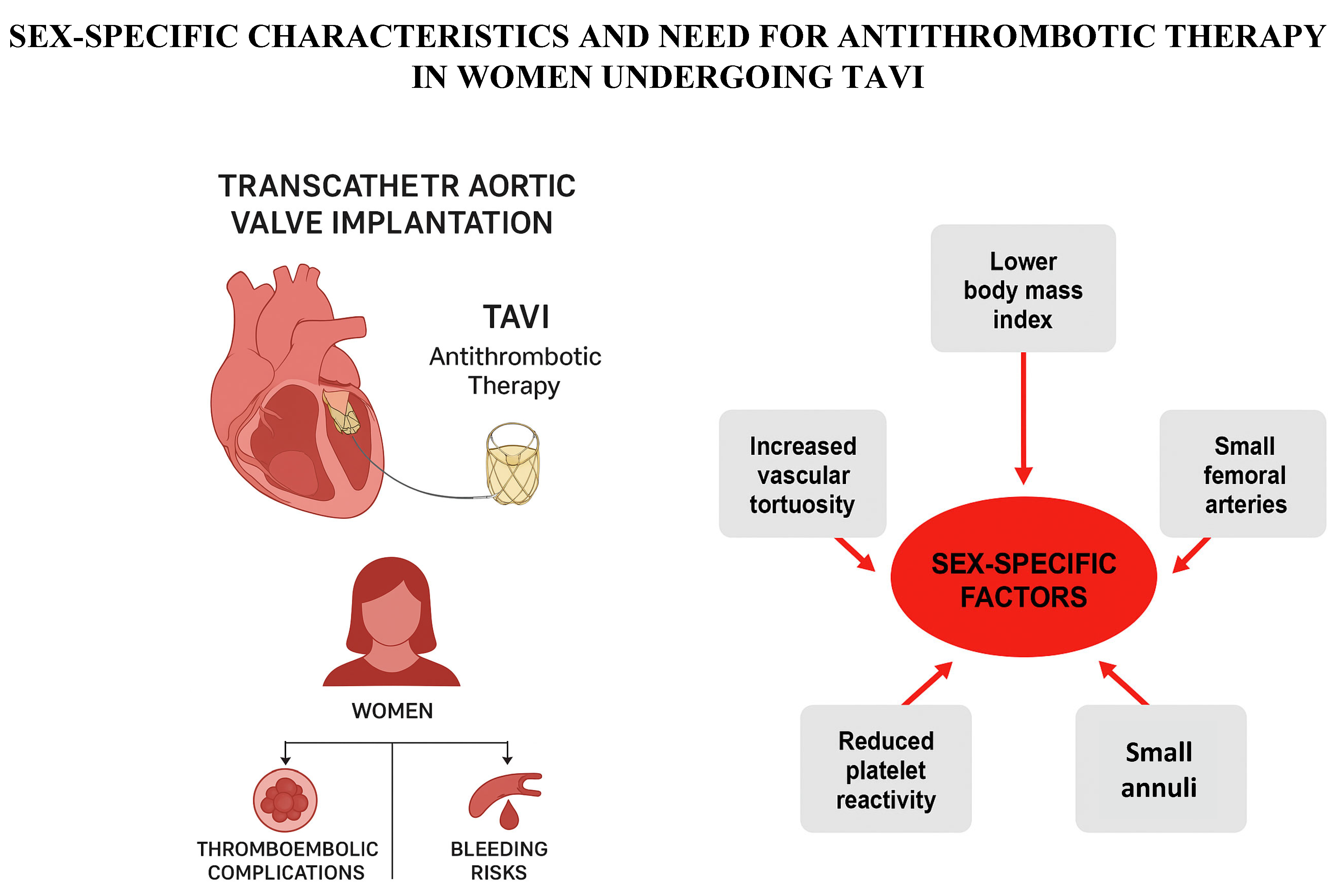 | PARTNER 2 and 3 subanalysis | >1000 | DAPT vs. SAPT (historical context) | Women had a higher risk of vascular complications (17.3% vs. 10.0%; 95% CI 4.63–9.95; p < 0.001) and major bleeding (10.5% vs. 7.7%; 95% CI 0.57–5.04; p = 0.012). Not primarily focused on therapy but supports anatomical susceptibility. |