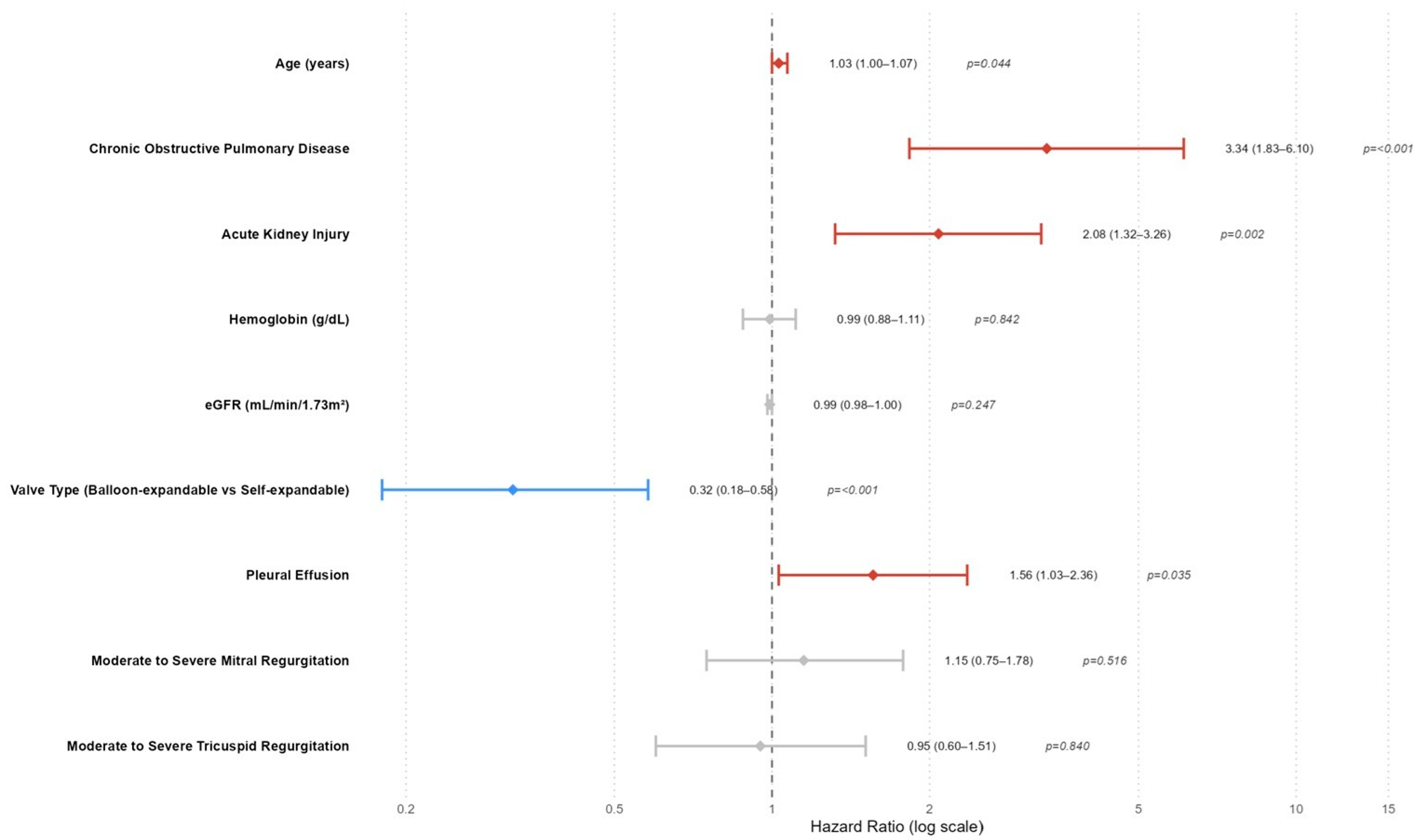 p = 0.035), suggesting that fluid accumulation may reflect or contribute to adverse outcomes. Notably, the type of valve used had a protective effect; balloon-expandable valves were associated with significantly reduced mortality risk compared to self-expandable valves (HR: 0.32; 95% CI: 0.18–0.58;