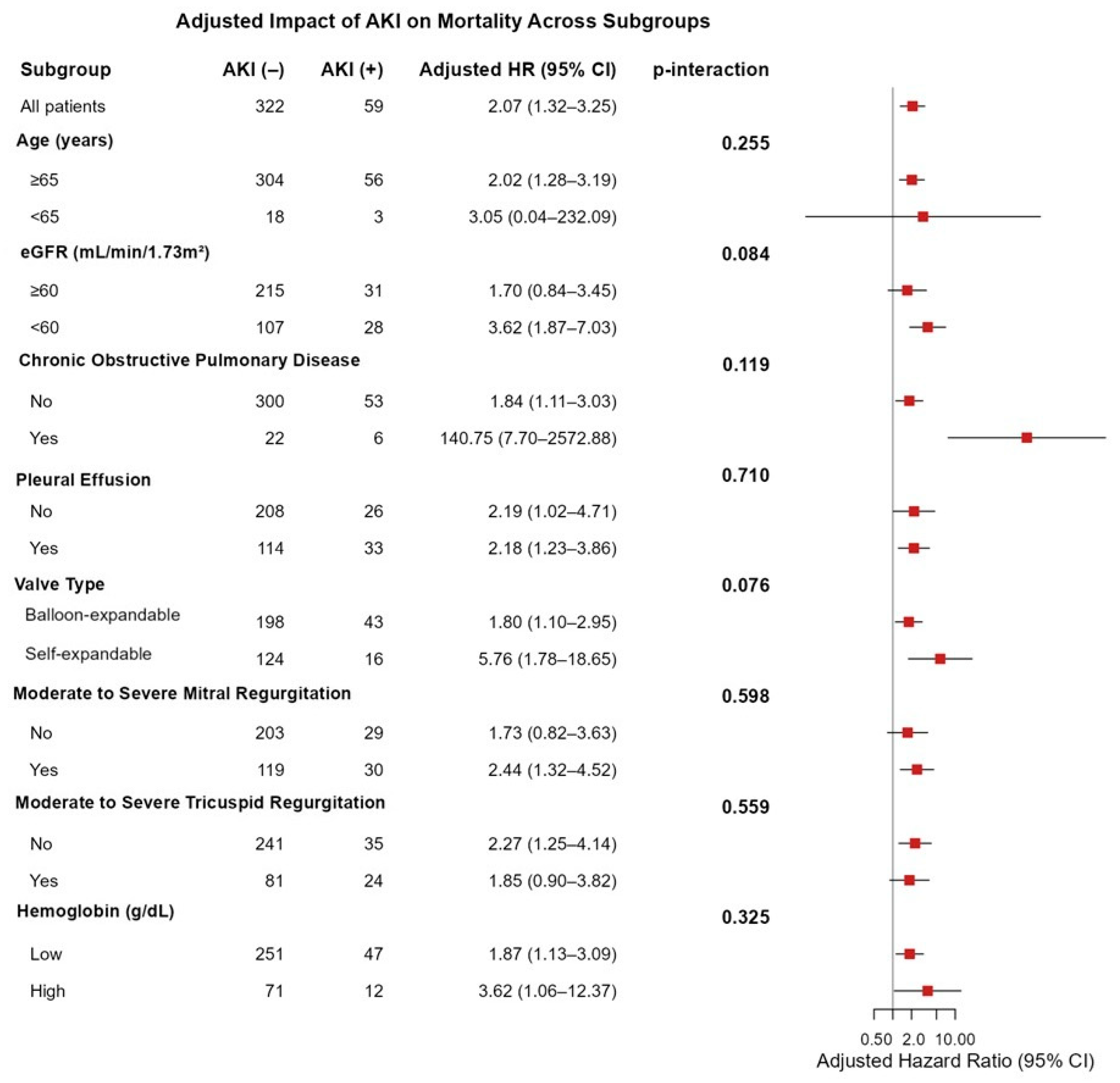 In the overall population, AKI was independently associated with increased mortality (adjusted HR: 2.07, 95% CI 1.32–3.25). The subgroup analyses demonstrated that the adverse prognostic effect of AKI on mortality was consistent across all predefined clinical subgroups, with no statistically significant interactions observed (all