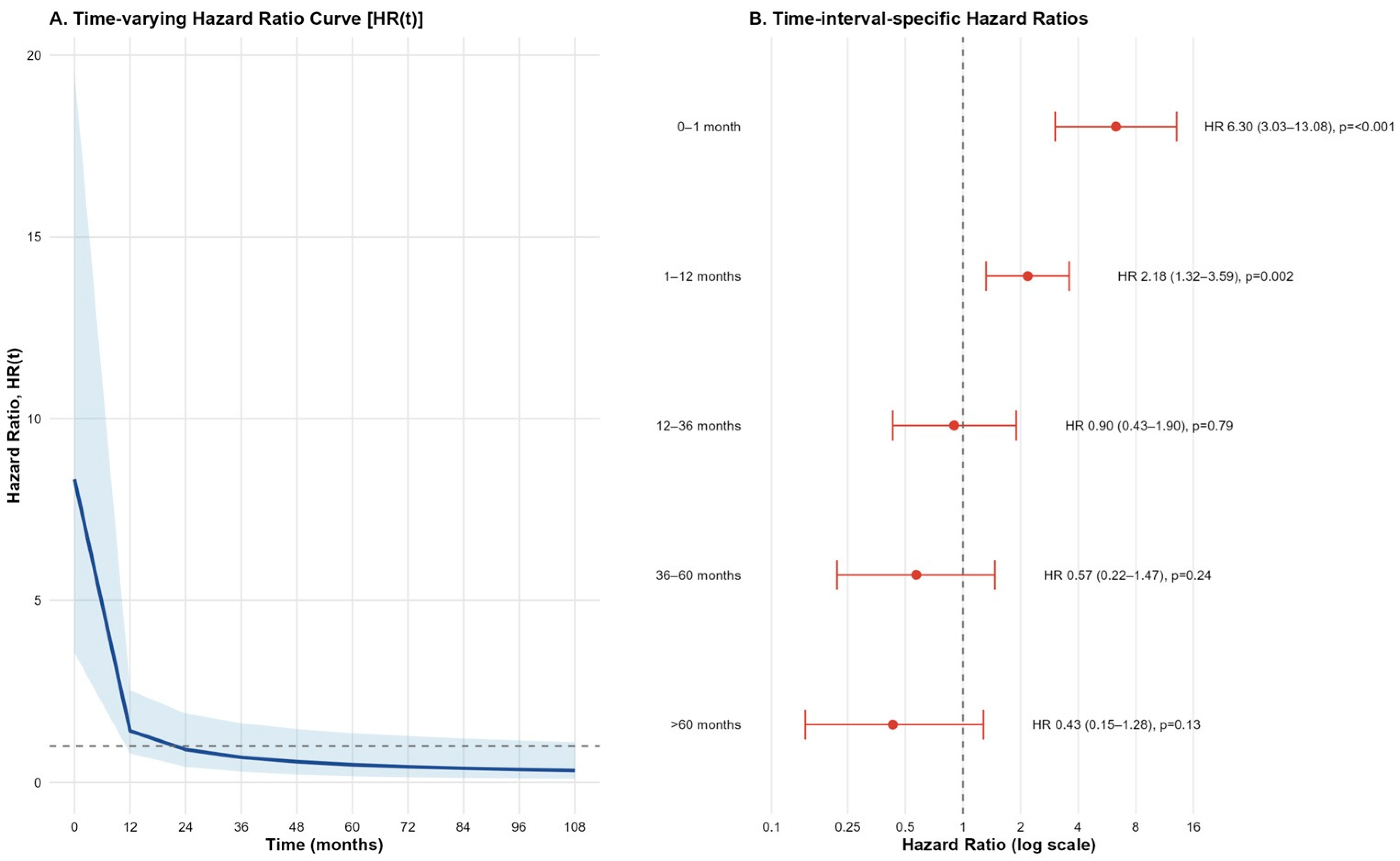 The time-varying hazard ratio analysis demonstrated that the mortality risk was significantly elevated during the early post-procedural period, with the highest hazard observed within the first month (HR: 6.30; 95% CI: 3.03–13.08;