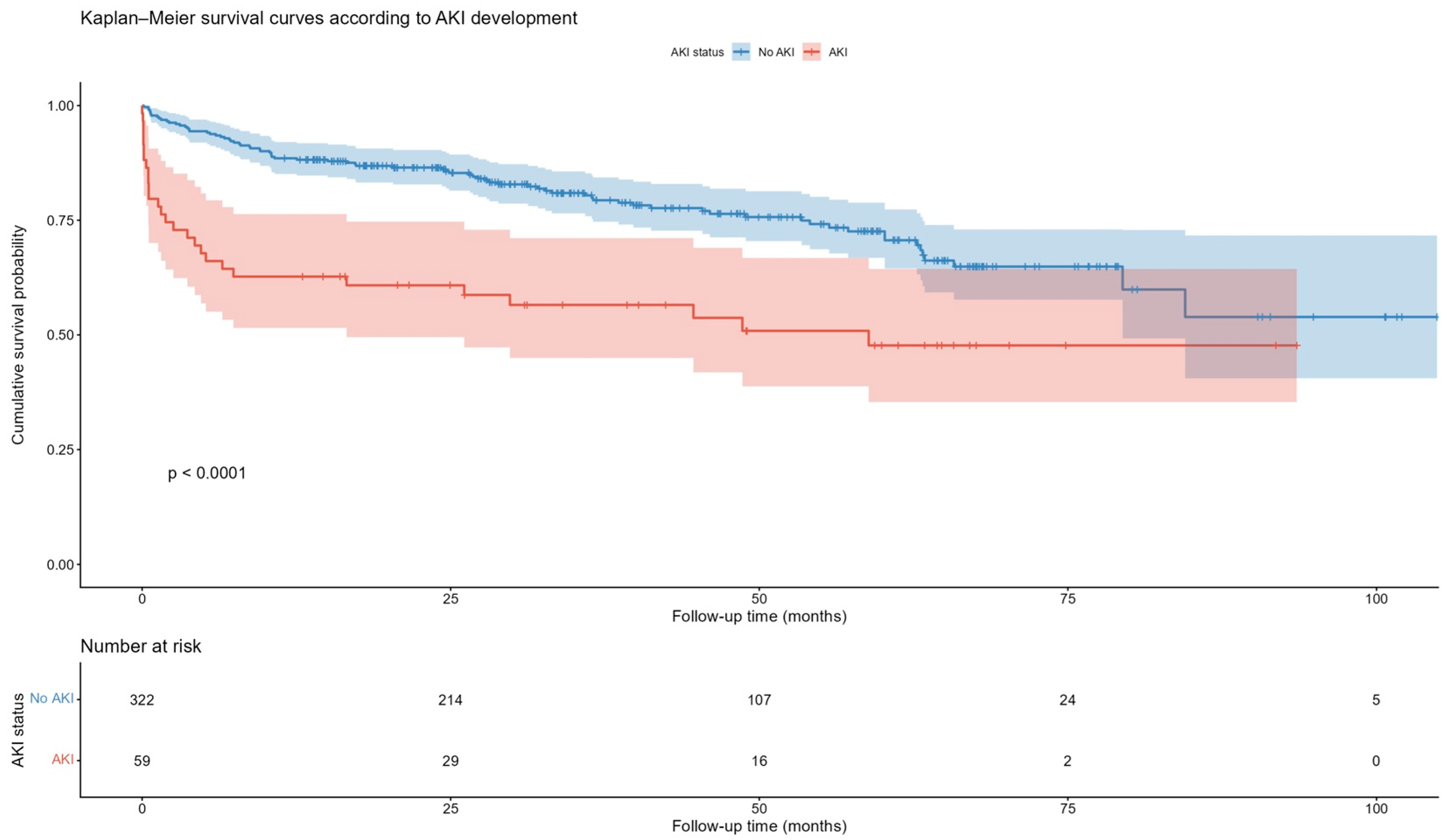 Kaplan–Meier survival analysis demonstrated a significantly lower cumulative survival probability in patients who developed AKI following TAVI compared to those without AKI (Log-rank