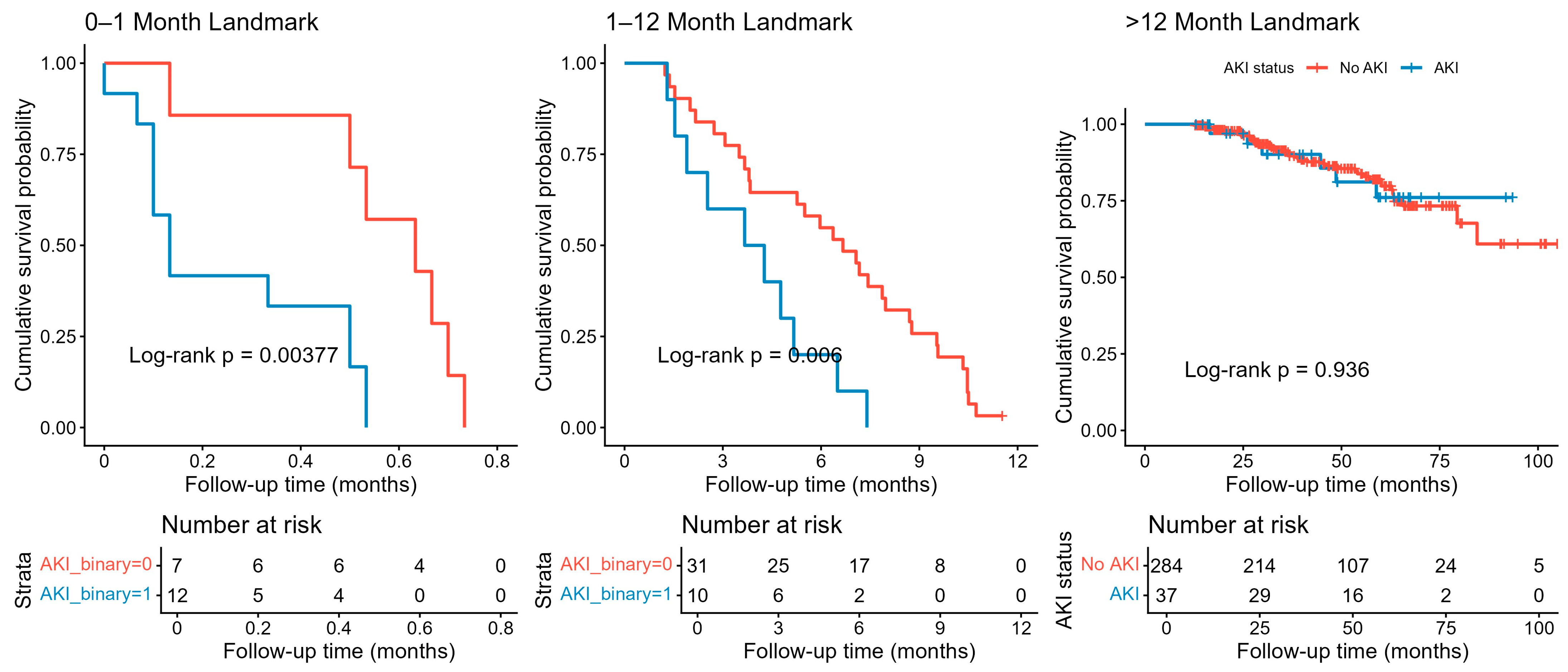 Landmark survival analysis revealed a significant impact of AKI on short-term mortality following TAVI. In the 0–1 month interval, patients with AKI exhibited significantly lower survival compared to those without AKI (Log-rank