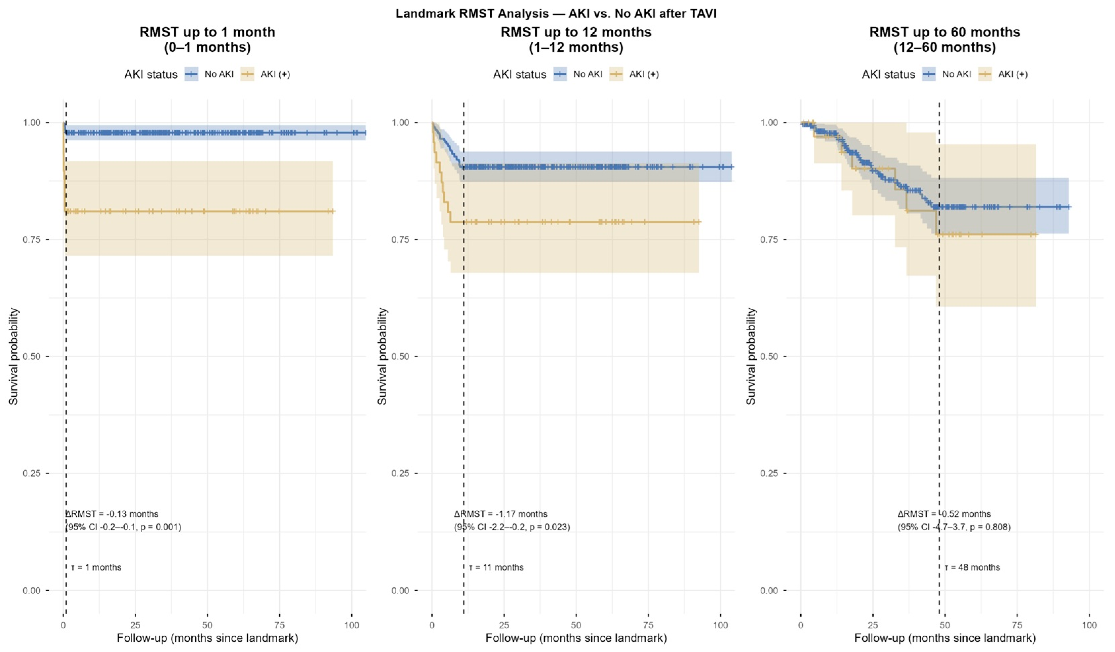 In landmark RMST analysis, patients with post-TAVI-AKI showed significantly reduced mean survival time compared with those without AKI during the early (ΔRMST = −0.13 months,