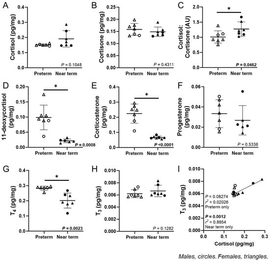 Hormone concentrations of fetal cardiac tissue. The fetal cardiac concentration of cortisol (A) and cortisone (B) were not different between preterm and near-term fetuses. The cortisol: cortisone ratio (C) was higher, while 11-deoxycortisol (D) and corticosterone (E) were lower with no change in progesterone (F) in the near-term compared to preterm fetuses. T4 (G) was lower with no change in T3 (H) concentrations in the near-term compared to preterm fetuses. In the near-term fetuses only, there were positive linear relationships of T3 with cortisol (I). Males (M) = circles, females (F) = triangles. preterm, left ventricle (LV) tissue from fetuses at 116 days of gestation (dG) (open symbols; hormone = 2M, 5F). Near-term, LV tissue from fetuses at 140 dG (closed symbols; hormone = 3M, 4F). One sample per animal was analysed via LC-MS/MS. Data were excluded due to a technical error in hormone concentration. Up to one outlier was excluded per group using the Grubbs method (Alpha = 0.05), when applicable. Data are expressed as mean ± SD and were analysed using either an unpaired t-test or simple linear regression. Data for progesterone, T3, and T4 failed the normality test and were consequently analysed using the Mann–Whitney test. (*) indicates a statistically significant difference between the groups. p < 0.05 was considered significant. AU: arbitrary unit.