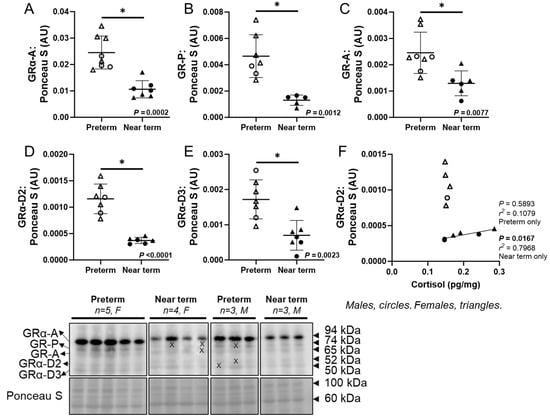 Abundance of glucocorticoid receptor isoforms in the fetal heart. The cardiac protein abundance of glucocorticoid receptors (GR) including GRα-A (A), GR-P (B), GR-A (C), GRα-D2 (D), and GRα-D3 (E) was lower in the near-term compared to preterm fetuses. In the near-term fetuses only, there was a positive linear relationship between cortisol and GRα-D2 (F). Males (M) = circles, females (F) = triangles. Preterm, left ventricle (LV) tissue from fetuses at 116 days of gestation (dG) (open symbols; protein = 3M, 5F; hormone = 2M, 5F). Near-term, LV tissue from fetuses at 140 dG (closed symbols; protein = 3M, 4F; hormone = 3M, 4F). One sample per animal was run per Western blot and LC-MS/MS. Data were excluded due to a technical error in hormone concentration. Up to one outlier was excluded per group using the Grubbs method (Alpha = 0.05) when applicable. Data were expressed as mean ± SD and were analysed using either an unpaired t-test or simple linear regression. (*) indicates a statistically significant difference between the groups. p < 0.05 was considered significant. AU: arbitrary unit. (X) indicates data excluded from analysis (due to a defect on the band/s).