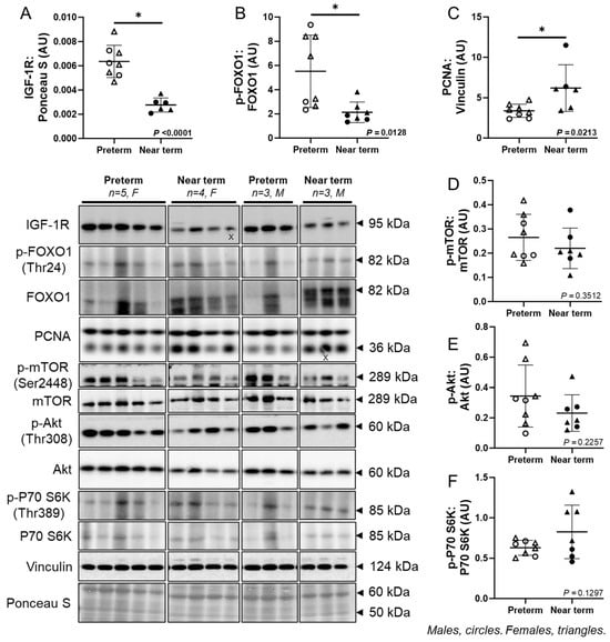 Molecular markers of fetal cardiac growth. The cardiac protein expression of IGF-1R (A) and p-FOXO1:FOXO1 ratio (B) was lower, while PCNA (C) was higher in the near term compared to preterm fetuses. There was no difference in the p-mTOR:mTOR ratio (D), p-Akt:Akt ratio (E), and p-P70 S6K:P70 S6K ratio (F) between the groups. Males (M) = circles, females (F) = triangles. Preterm, left ventricle (LV) tissue from fetuses at 116 days of gestation (dG) (open symbols; protein = 3M, 5F). Near-term, LV tissue from fetuses at 140 dG (closed symbols; protein = 3M, 4F). One sample per animal was run per Western blot. Up to one outlier was excluded per group using the Grubbs method (Alpha = 0.05), when applicable. Data are expressed as mean ± SD and were analysed either using an unpaired t-test or simple linear regression. (*) indicates a statistically significant difference between the groups. p < 0.05 was considered significant. AU: arbitrary unit. (X) indicates data excluded from analysis (due to a defect on the band/s).