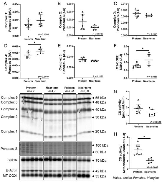 Molecular markers of fetal cardiac OXPHOS and mitochondrial content. The cardiac protein abundance of complex 4 (D) was higher in the near-term compared to preterm fetuses, while there was no difference in complex 1 (A), 2 (B), 3 (C), and 5 (E). The MT-COXI: SDHA ratio (F), a marker of mitochondrial content) was higher in the near-term compared to preterm fetuses. CS activity (G) did not differ between the groups, while CS activity: mitochondrial content ratio (H) was lower in the near-term compared to preterm fetuses. Males (M) = circles, females (F) = triangles. Preterm, left ventricle (LV) tissue from fetuses at 116 days of gestation (dG) (open symbols; protein/CS activity = 3M, 5F). Near-term, LV tissue from fetuses at 140 dG (closed symbols; protein/CS activity = 3M, 4F). One sample per animal was run per Western blot and CS activity. Up to one outlier was excluded per group using the Grubbs method (Alpha = 0.05), when applicable. Data are expressed as mean ± SD and were analysed using either an unpaired t-test or simple linear regression. (*) indicates a statistically significant difference between the groups. p < 0.05 was considered significant. AU: arbitrary unit. (X) indicates data excluded from analysis (due to a defect on the band/s).