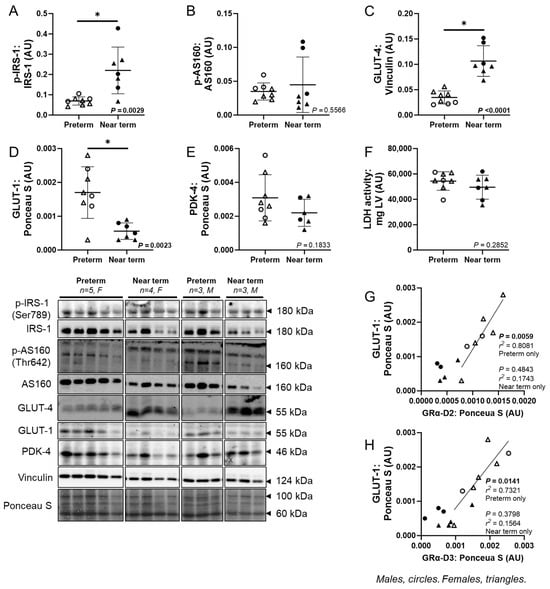 Molecular markers of fetal cardiac glucose metabolism. The ratio of p-IRS-1:IRS-1 ratio (A) and GLUT-4 (C) were higher, while the ratio of p-AS160:AS160 (B) was not different, and GLUT-1 (D) was lower in the near-term compared to preterm fetuses. The abundance of PDK-4 protein (E), and activity of LDH (F) were not different in preterm and near-term fetuses. In the preterm fetuses only, there were positive linear relationships between GRα-D2 and GLUT-1 (G), as well as GRα-D3 and GLUT-1 (H). Males (M) = circles, females (F) = triangles. Preterm, left ventricle (LV) tissue from fetuses at 116 days of gestation (dG) (open symbols; protein/LDH activity = 3M, 5F). Near-term, LV tissue from fetuses at 140 dG (closed symbols; protein/LDH activity = 3M, 4F). One sample per animal was run per Western blot and LDH activity. Up to one outlier was excluded per group using the Grubbs method (Alpha = 0.05), when applicable. Data are expressed as mean ± SD and were analysed using either an unpaired t-test or simple linear regression. Data for p-AS160:AS160 ratio failed the normality test and were consequently analysed using the Mann–Whitney test. (*) indicates a statistically significant difference between the groups. p < 0.05 was considered significant. AU: arbitrary unit. (X) indicates data excluded from analysis (due to a defect on the band/s).