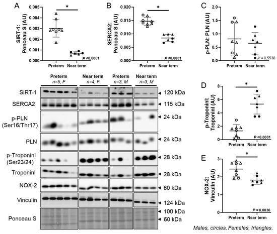 Molecular markers of fetal cardiac contractility. The expression of SIRT-1 (A) and SERCA2 (B) in cardiac tissue was lower, while there was no difference in the ratio of p-PLN:PLN (C) in the near-term compared to preterm fetuses. The ratio of p-TroponinI:TroponinI (D) was higher, while NOX-2 (E) was lower in near-term compared to preterm fetuses. Males (M) = circles, females (F) = triangles. Preterm, left ventricle (LV) tissue from fetuses at 116 days of gestation (dG) (open symbols; protein = 3M, 5F). Near-term, LV tissue from fetuses at 140 dG (closed symbols; protein = 3M, 4F). One sample per animal was run per Western blot. Up to one outlier was excluded per group using the Grubbs method (Alpha = 0.05), when applicable. Data are expressed as mean ± SD and were analysed using either an unpaired t-test or simple linear regression. (*) indicates a statistically significant difference between the groups. p < 0.05 was considered significant. AU: arbitrary unit.