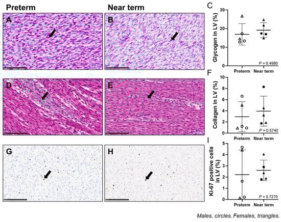 Fetal cardiac glycogen, collagen, and Ki67 staining: 20× magnification representative micrograph of glycogen staining using PAS (black arrow indicates glycogen stained in magenta) in preterm (A) and near term (B). 20× magnification representative micrograph of collagen staining using Masson’s trichrome (black arrow indicates collagen stained in blue) in preterm (D) and near term (E). 40× magnification representative micrograph of Ki67 staining using IHC (black arrow) in preterm (G) and near term (H). The fetal cardiac glycogen (C), collagen (F), and Ki67 (I) staining were not different between preterm and near-term fetuses. Males (M) = circles, females (F) = triangles. Preterm, left ventricle (LV) tissue from fetuses at 116 days of gestation (dG) (open symbols; histology/IHC = 3M, 2F). Near-term, LV tissue from fetuses at 140 dG (closed symbols; histology/IHC = 2M, 3F). One sample per animal was run per histology and IHC. A smaller subset of animals was included in this analysis due to missing fixed tissue samples. Scale bars = 100 μm. Data are expressed as mean ± SD and were analysed using an unpaired t-test. p < 0.05 was considered significant.