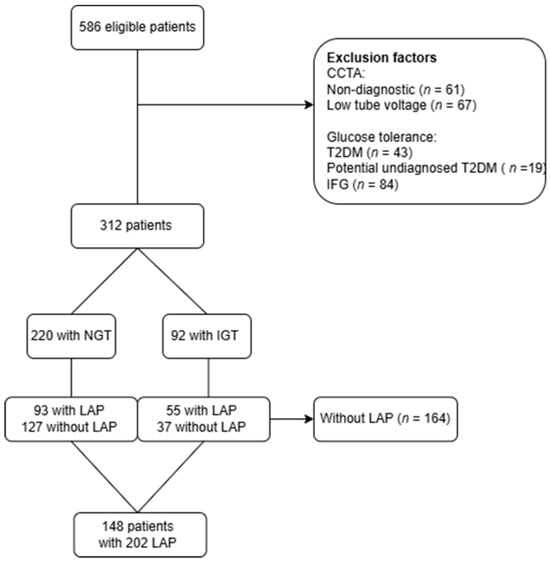 A total of 586 consecutive patients with suspected CAD were initially enrolled (Figure 1). Patients with non-diagnostic CCTA scans were excluded (n = 61), and those scanned with low tube voltage were excluded for comparability reasons, as shown by Takagi et al. [14]. Next, glucose tolerance was evaluated and those with a T2DM diagnosis were excluded. For transparency, the characteristics and plaque data of T2DM patients, alongside those of NGT and IGT patients, have been included in the supplemental material (Tables S1 and S2). To ensure the exclusion of potentially undiagnosed T2DM, individuals with fasting plasma glucose (FPG) levels > 7.0 mmol/L or 2-h glucose values ≥ 11.1 mmol/L were excluded. Additionally, patients with IFG were excluded because of their high degree of similarity to those with normal glucose tolerance (NGT). This resulted in 312 patients, including 220 with NGT and 92 with IGT. Figure 1 illustrates the process of the study sample selection. Lesions with LAP were present in 93 of the 220 patients with NGT and 55 of the 92 patients with IGT, while those without a LAP lesion were excluded (n = 164).