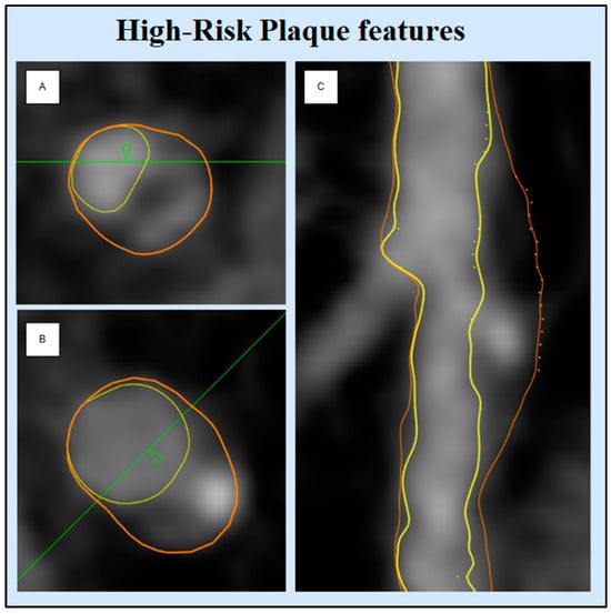 All vessels were examined for visible plaques and further evaluated using the semi-automatic software. Only lesions containing a minimum volume of LAP > 1 mm3 were evaluated [8]. The following high-risk plaque characteristics were extracted automatically per patient: total atheroma volume (TAV), vessel length, volumes of calcified plaque, non-calcified plaque, low-attenuation plaque, and lumen. Tissue volumes were extracted based on Hounsfield Unit (HU) values using a dynamic algorithm, converting HU thresholds into volumes according to luminal contrast densities [17]. The plaque burdens were calculated post-data extraction: percent plaque volume (PPV) per individual plaque component [(total calcified, non-calcified, and low attenuation plaque volume/total plaque volume) × 100%]. The coronary artery calcium score (CACS) was calculated using the Agatston method on non-contrast CCTA images [18]. HRP features, including NRS, RI, and SC, were evaluated for each LAP lesion identified (Figure 2). The napkin-ring sign was defined by a central area of low attenuation inside a semicircular area of higher attenuation (Figure 2A). Spotty calcifications were defined as small calcifications of <3 mm in any direction (Figure 2B). Positive remodeling index was calculated as the ratio of lesion plaque area to proximal reference area (Figure 2C) [19].