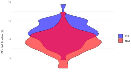 Low-attenuation plaque burden according to glycemic tolerance. This violin plot depicts the distribution of low-attenuation plaque burden (measured as a percentage of total plaque volume) in patients with impaired glucose tolerance (IGT, shown in blue) and normal glucose tolerance (NGT, shown in red). The width of each violin represents the density of patients with corresponding plaque burden values, highlighting the variation and overlap between the two groups.