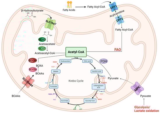 Substrate utilization of the myocardium. The heart utilizes various sources of fuel to drive adenosine triphosphate (ATP) production in the mitochondria. Fatty acid oxidation (FAO) is the main source of fuel. Once fatty acids are transported into the cytosol, carnitine palmitoyl transferase 1 (CPT1) adds a carnitine group on them, allowing for transport into the IMM. CPT2 then removes the carnitine group as it transports the fatty acids into the mitochondrial matrix (MM), where FAO takes place, yielding Acetyl-CoA. Glucose oxidation is still present in the mature cardiomyocytes, except at a lower rate. Glucose transporters introduce glucose and lactate into the cytosol, where they undergo glycolysis. The end product, pyruvate, gets transported into the MM by mitochondria pyruvate carrier (MPC), where pyruvate dehydrogenase (PDH) converts it into Acetyl-CoA. Ketones, such as 3-hydroxybutyrate, often play a small role in energy production in the mitochondria. As it is a small-carbon-chain molecule, it is easily defused though the OMM and then transported into the matrix by SLC16a7 transporter, where it undergoes ketolysis. B-hydroxybutyrate dehydrogenase 1 (BDH1) converts it into acetoacetate, followed by succinyl-CoA-oxoacid transferase (SCOT) conversion into acetoacetyl-CoA. This molecule gets cleaved into 2 Acetyl-CoA molecules. Branched-chain amino acids (BCAAs), under normal circumstances, also play a supporting role in mitochondrial metabolism. Different amino acids are transported into the matrix via BCAA symporter, where they are converted to ketoacids by branched-chain amino acid aminotransferase (BCATm) enzymatic activity. Branched-chain acid alpha-keto acid dehydrogenase (BCKDH) then converts these ketoacids into Acetyl-CoA. The Acetyl-CoA from all these fuel sources is responsible for feeding the Tricarboxylic acid cycle (Krebs cycle) that generates the reducing equivalents required to transfer electrons through the electron transport chain (ETC) complexes, resulting in adenosine triphosphate (ATP) production.