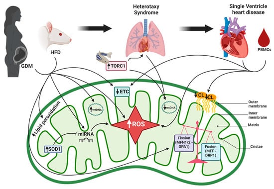 Mitochondrial dysfunction associated with gestational diabetes, heterotaxy syndrome and single-ventricle disease. Gestational diabetes mellitus (GDM) has been associated with heterotaxy syndrome and single-ventricle heart disease. GDM and the high-fat diet (HFD) rat model lead to a mitochondrial dysfunction characterized by an increase in lipid peroxidation, increase in mtDNA copy number and a pro-fission pattern by increasing expression of mitofusin 1/2 (MFN) and optic atrophy 1 (OPA1). The electron transport chain (ETC) is disrupted, and an increase in reactive oxygen species ROS occurred during GDM and single-ventricle heart disease. An overexpression of superoxide dismutase 1 (SOD1) in rat repressed GDM-regulated miRNAs and blunted the increase in ROS induced by GDM. Inhibition of rapamycin complex 1 (TORC1) in zebrafish induces a heterotaxy phenotype and modulates mitochondrial biogenesis by decreasing mtDNA content. In addition, blood from heterotaxy patients presents a lower mtDNA content. Myocardium and peripheral blood mononuclear cells (PBMCs) from single-ventricle patients show a decrease in mitochondrial respiratory function and cardiolipin (CL) content, which is associated with an increase in ROS. MFF, mitochondrial fission factor; DRP1, dynamin-related protein 1. This figure was created using Biorender.com.