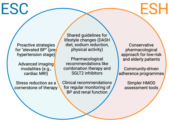 Prevention strategies across ESC and ESH guidelines. Venn diagram displaying the evidence-based interventions endorsed uniquely or heavily emphasised in the ESC guidelines (left), ESH guidelines (right), and both guidelines (centre) for HHD prevention. BP, blood pressure; ESC, European Society of Cardiology; ESH, European Society of Hypertension; HMOD, Hypertension-mediated organ damage.