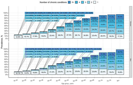 The number of patients with one chronic disease increased with age, varying from 13.3% in the 18–24 age group to 95.2% among individuals 80 years old and older (p < 0.001). The prevalence and number of chronic conditions based on gender and different age groups are shown in Figure 1.