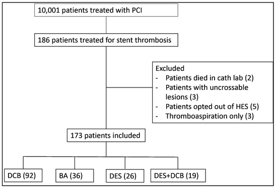 The aSsessment of PAclitaxel dRug coaTed balloon only ANgioplasty for Stent Thrombosis (SPARTAN-ST) study was an investigator-initiated, single-centre, cohort study. In our institution, patients treated with percutaneous coronary intervention (PCI) are collated prospectively in a dedicated database. Following approval from the Northwest Haydock research ethics committee and institutional approval from the Norfolk & Norwich University Hospital and the University of East Anglia ethics committee, we retrospectively surveyed our prospective clinical database to identify all patients treated for ST between June 2011 and November 2019. The confidentiality advisory group waived the necessity for patient consent due to the retrospective nature of our study. The study protocol conforms to the ethical guidelines of the 1975 Declaration of Helsinki as reflected in a priori approval by our institution’s human research committee. We excluded patients who died in the catheterisation laboratory at the time of the index procedure, patients with uncrossable lesions and patients who were treated with thrombectomy only due to very low numbers (Figure 1). (Registration: https://clinicaltrials.gov/ct2/show/NCT04482972 Unique identifier: NCT04482972).