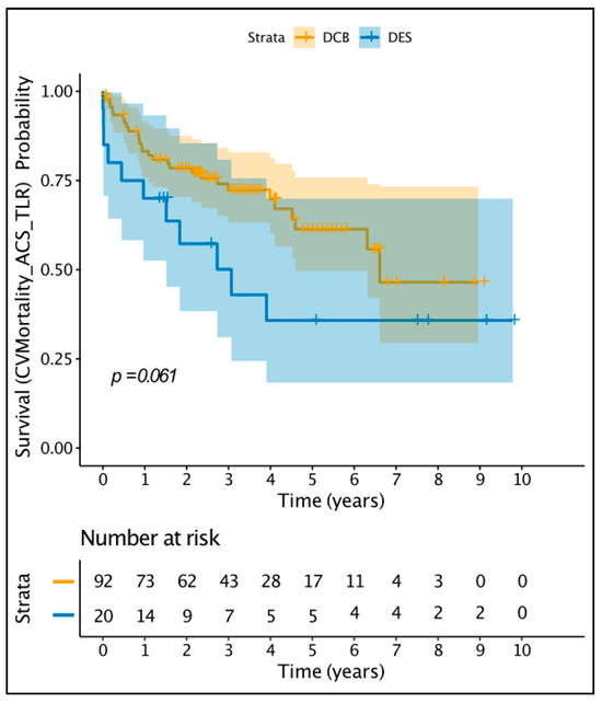 A total of 173 patients were identified; 92 were treated with DCB, 36 with balloon angioplasty (BA), 26 with DES, and 19 with a combination of DES and DCB. DCB-only angioplasty necessitates optimal vessel preparation prior to final treatment of the vessel with DCB, in a standard fashion as described in the DCB consensus document [10]. The patient baseline characteristics and clinical and angiographic characteristics of the full cohort are provided in Supplementary Table S2, while Supplementary Tables S3 and S4 provide the characteristics of patients with late or very-late stent thrombosis. As all patients treated with DCB-only angioplasty had late or very-late stent thrombosis, we elected to continue data analysis including only patients with late or very-late stent thrombosis, comparing DCB-only vs. DES, which were the two largest groups. The DCB used was paclitaxel-based (SeQuent Please or SeQuent Please NEO) while the great majority of DES used was second generation (85%). The use of DCB-only angioplasty, including ISR, stent thrombosis, de novo disease steadily increased over the time period of our study, as our operators became more experienced and comfortable with this technology. Table 1 demonstrates the baseline patient characteristics, while Table 2 demonstrates the clinical and angiographic characteristics. The median age was 67 (57–74) years old and 79% of patients were male. There were very few differences in the baseline patient characteristics. The DES group had significantly more patients with a history of coronary artery bypass and significantly lower estimated glomerular filtration rate. However, the median eGFR for both groups were in the mildly decreased range (>60 mL/min/1.73 m2). In terms of the clinical and angiographic characteristics, the DCB group had significantly more patients with very late stent thrombosis, while the DES group had larger vessel diameters. However, the vessel diameters of both groups were in the large-vessel category. After a median follow up of 3.5 years, the primary combined endpoint of cardiovascular mortality or ACS or TLR occurred in 29 patients (32%) in the DCB-only group vs. 11 patients (55%) in the DES group (p = 0.06), as shown in the Kaplan–Meier estimator plot (Figure 2). Univariate Cox regression analysis identified diabetes and intubation as adverse prognostic indicators of the primary endpoint while use of GPIIb/IIIa inhibitors and presentation with very late stent thrombosis were associated with better prognosis (Supplementary Table S5).