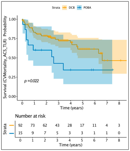 Furthermore, we compared DCB vs. POBA in patients with late or very-late ST, aiming to explore if there is a benefit of DCB in addition to POBA. As demonstrated in Supplementary Table S6, the groups were very well balanced in terms of clinical and angiographic characteristics. The only difference was the lesion length, which was significantly longer in the DCB group (26 vs. 20 mm, p = 0.002). Kaplan–Meier estimator plot analysis (Figure 3) demonstrated a significant difference between DCB and POBA in favour of DCB, in terms of the combined endpoint of cardiovascular mortality or ACS or TLR (p = 0.022), driven mainly by the TLR.
