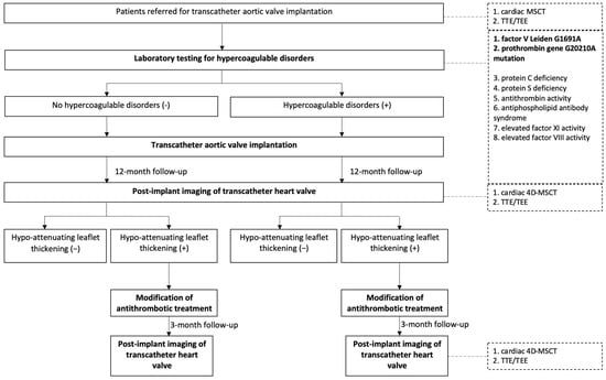 In the first stage of the study (hospitalization during the preoperative period), cardiac CT angiography and transthoracic/transesophageal echocardiography were performed in all patients included in the study as part of standard care. Additionally, 10 mL of venous blood was collected for laboratory assessment of hypercoagulable disorders. Based on the test results, patients were divided into two groups: those with thrombophilia and those without thrombophilia (Figure 1). In the next stage of the study, 12 months after TAVI, multimodal post-implant imaging of the transcatheter aortic valve was conducted. For patients with HALT, antithrombotic treatment was modified at the physician’s discretion. Repeated post-implant CT imaging was performed after 3 months to evaluate the progression or resolution of HALT. Patient recruitment began in November 2019 and is expected to be completed within 5 years.