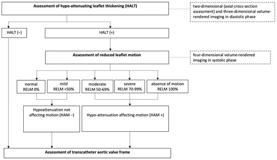 CT scans were performed in all patients at least 48 h before the planned TAVI as part of standard care and assessed with dedicated software (3mensio Structural Heart 10.0; 3mensio Medical Imaging BV, Bilthoven, The Netherlands). CT imaging was conducted during post-discharge follow-up visits 12 months after TAVI to evaluate the transcatheter heart valve and was repeated after 3 months in patients diagnosed with HALT to assess its evolution over time. CT scans were obtained using the standardized protocol described previously [].