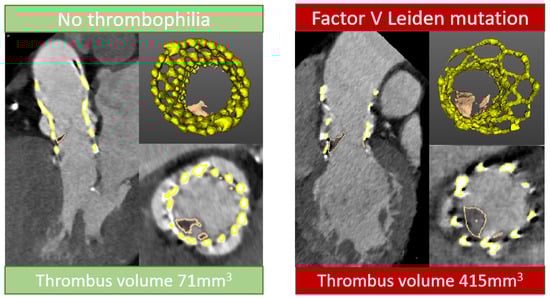 The low incidence of thromboembolic events in both the TAVI and control populations reflects benign implications for the incidental findings of most thrombophilias in healthy conditions. The impact of such disorders on bioprosthetic valves remains unknown. To date, only a single study has reported the prevalence of thrombophilia in patients undergoing TAVI for severe aortic stenosis. Nevertheless, the number of patients with the condition was significantly below the expected frequencies, which suggests their underdetection []. Although statistically underpowered, our early results do not show a higher prevalence of HALT in patients with thrombophilia. The quantitative assessment of HALT, however, shows higher thrombus volumes in patients with thrombophilia. This may reflect the incremental role in hypercoagulability once the thrombus is already formed. Following the full enrolment into this study, we will be able to evaluate the role of thrombophilia in forming HALT using a novel approach to thrombus quantification that measures volume and attenuation from CT angiography. Moreover, the post-procedural CTA will provide information on the deformation of the transcatheter bioprostheses, which has been previously shown to influence the prevalence of HALT [].