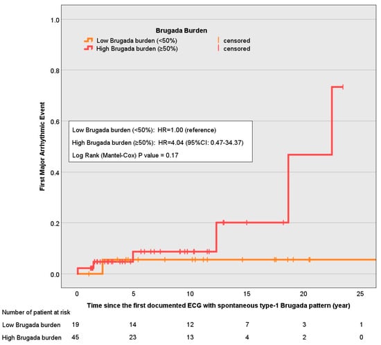 Risk stratification in Brugada Syndrome remains challenging due to the variability in arrhythmic risk across patient populations. Current efforts focus on identifying patients at high risk of sudden cardiac death or major arrhythmic events while avoiding overtreatment in low-risk individuals. The spontaneous type-1 Brugada pattern is a well-known risk factor associated with major arrhythmic events in Brugada syndrome []. A recent study reported fluctuations in patients with spontaneous type-1 Brugada patterns during follow-up and evaluated the association between the burden of the type-1 Brugada pattern on 12-lead Holter monitoring and the history of major arrhythmic events []. However, no studies have explored the specific association between the burden of spontaneous type-1 Brugada pattern and the occurrence of first major arrhythmic events. Therefore, our study aims to define the burden of type-1 Brugada patterns and assess their association with patients’ first major arrhythmic events.